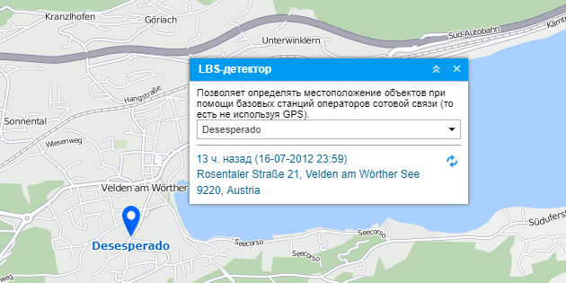 После выбора объекта поиск его местоположения осуществляется автоматически. Затем карта центрируется на найденном местоположении, которое, в свою очередь, будет выделено при помощи синего маркера. Также под маркером может быть отображено/скрыто имя объекта, за что отвечает соответствующая кнопка в нижней панели. Кроме того, в окне LBS-детектора отображается информация, которая включает в себя время фиксации последнего местоположения, а также его адрес. Справа от данной информации располагается кнопка обновления по нажатии на которую вы получите более актуальную информацию о местоположении выбранного вами объекта, если таковая имеется.
