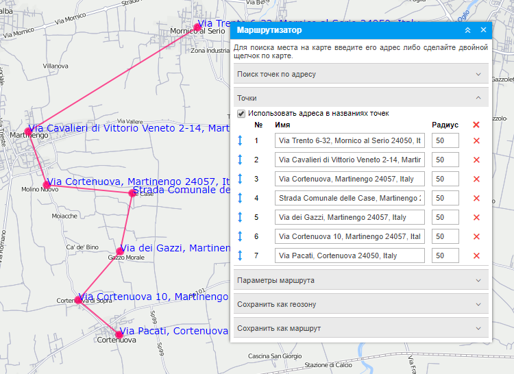 Достаточно просто сделать ряд двойных щелчков мыши по карте, чтобы указать необходимые пункты. При этом, если стоит флаг Использовать адреса в названиях точек в панели Точки, то доступные адреса автоматически прописываются как названия точек. Если адресная информация отсутствует, точка добавляется все равно, только без имени.