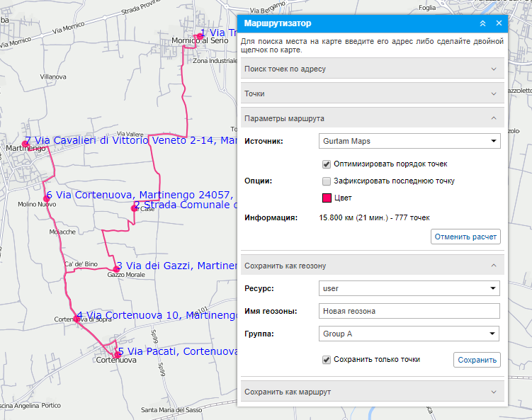 После того как маршрут проложен, он может быть сохранен в качестве геозоны либо маршрута. Секция сохранения в качестве геозоны по умолчанию открывается после процедуры расчета. В ней необходимо ввести название геозоны, выбрать ресурс и группу геозон (при желании включить созданную геозону в уже существующую группу) и нажать Сохранить.