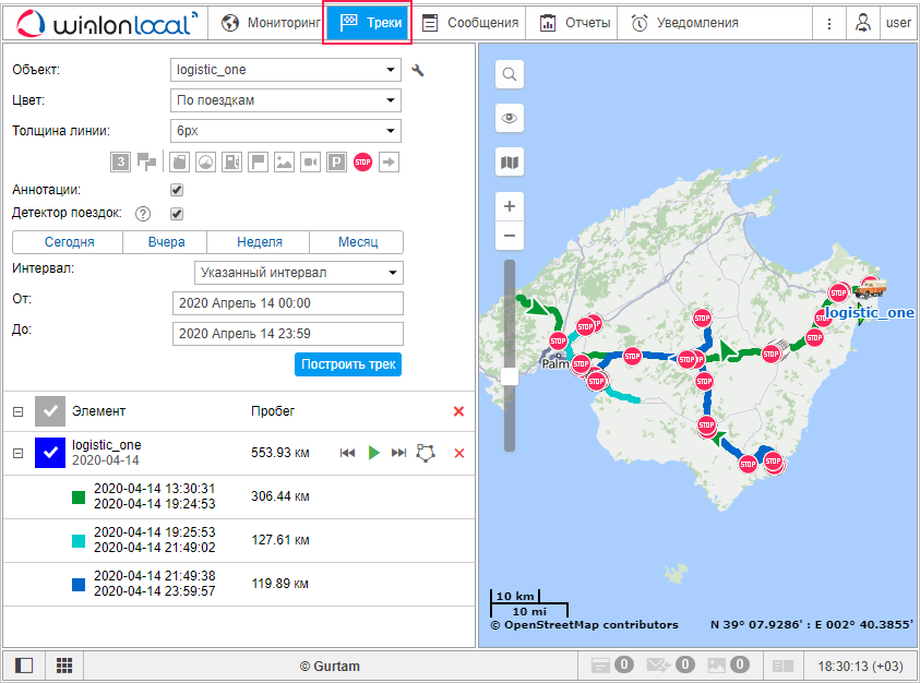 Можно нанести на карту любое количество треков за разные промежутки времени, причем как по разным объектам, так и для одного и того же объекта. Чтобы треки не сливались друг с другом, можно задавать для их отображения разные цвета, причем цвет может быть разным даже внутри одного трека — в зависимости от скорости движения, показаний датчика и т. п.