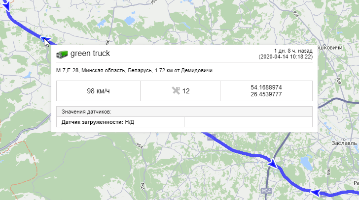 При наведении курсора на точку на треке появляется всплывающая подсказка, которая включает в себя следующую информацию: время последнего сообщения, положение объекта, присутствие в геозонах, скорость объекта, высота над уровнем моря, количество спутников, координаты точки, иконка объекта, значения датчиков, параметры (содержимое подсказки регулируется в настройках пользователя). Значения скорости, высоты и т. д., указанные во всплывающих подсказках, могут отображаться в различных системах мер. То же самое актуально и для значений пробега в списке треков (километры или мили).