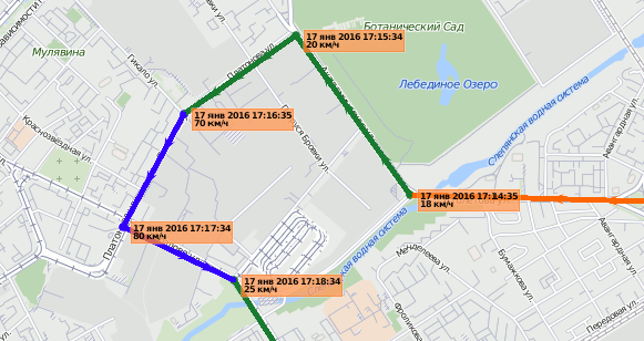 Точки трека могут сопровождаться аннотациями. Аннотации — это подсказки к каждой точке трека, откуда было получено сообщение от объекта. В них указана дата и время получения сообщения, а также скорость движения объекта в тот момент. Аннотации информативны, но утяжеляют визуальное восприятие линии трека, поэтому иногда их целесообразно отключить. Тем более, что достаточно подвести курсор к любой точке, чтобы просмотреть информацию во всплывающей подсказке.