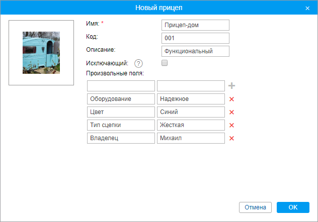 Нажмите кнопку Создать, чтобы вызвать диалог создания прицепа. Введите имя и другие свойства: код прицепа (для автоматического назначения), описание и любые произвольные поля — данная информация будет отображаться во всплывающей подсказке к прицепу и в отчетах. Можно загрузить фотографию прицепа в формате PNG, JPG, GIF и SVG — она будет использована для отображения прицепа в списке и на карте. Рекомендуется закачивать квадратные фотографии, чтобы их пропорции не искажались. Свойства, которые можно присвоить прицепам, такие же как у водителей.