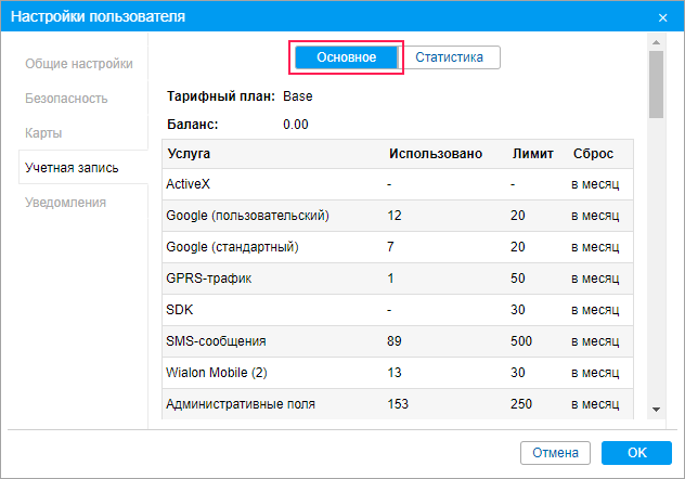 На вкладке Учетная запись находятся разделы Основное и Статистика. Для переключения между ними используйте кнопки в верхней части вкладки.