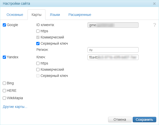 Укажите ключ активации. Для карт Google можно указать персональный или коммерческий ключ (опция Коммерческий). Если ранее были указаны настройки ключей для серверных запросов, то при активации опции Серверный ключ поле ID клиента заполняется автоматически. В поле Регион укажите двухбуквенный код вашего региона в системе ISO 3166-1 (alpha-2). Для работы карт по защищенному протоколу включите опцию https.