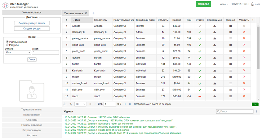 Система управления CMS Manager предназначена для пользователя верхнего уровня и пользователей с правами дилера и позволяет им настраивать структуру сервиса, управлять учетными записями, ресурсами, пользователями, объектами и другими макроэлементами системы.