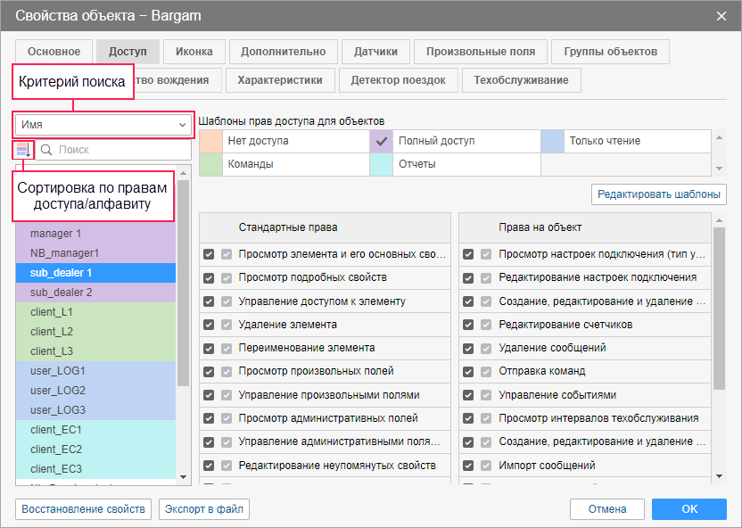 Шаблоны помогут упростить и ускорить установку прав доступа. Вы можете создать различные наборы прав для различных ролей, например, для диспетчера, менеджера, заказчика и т.п. Причем для каждого типа элемента (объекта, маршрута и т. п.) могут быть созданы свои шаблоны. Созданные шаблоны затем применяются к выбранным пользователям одним кликом мыши.