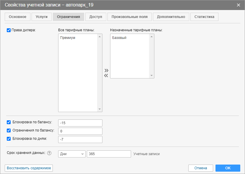 По умолчанию срок хранения данных берется из настроек тарифного плана. Если срок хранения данных, указанный для учетной записи, превышает период, указанный для тарифного плана, назначенного на эту учетную запись, то применяется срок из настроек тарифного плана. Если срок хранения данных в свойствах учетной записи меньше, чем тот, который указан для тарифного плана, то применяется срок из настроек учетной записи. Чтобы вернуть значение по умолчанию, укажите 0.