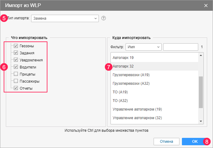 В открывшемся диалоговом окне импорта из WLP (механизм восстановления элементов аналогичен импорту из WLP-файла) выберите тип импорта.