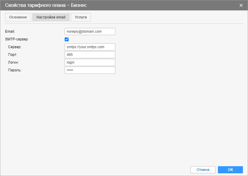 Для того чтобы при отправке системных сообщений использовался ваш SMTP-сервер, введите адрес электронной почты и включите опцию SMTP-сервер. Далее укажите сервер, порт, логин и пароль. Убедитесь, что в адресе сервера указан протокол: SMTP или SMTP****S. Как правило, для SMTP используются порты 25 и 587, для SMTPS — 465.