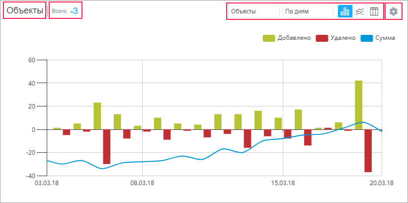 Имя графика указано слева в его шапке вместе с показателем Всего. Справа находятся выпадающие списки и кнопки-переключатели, которые, в зависимости от типа графика, позволяют изменить его вид, тип элемента или группировки. Здесь также расположена кнопка открытия окна настроек.