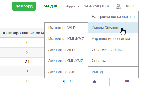 Функция импорта и экспорта позволяет копировать различные элементы и их свойства в отдельный файл или в другой элемент. Чтобы ей воспользоваться, в меню пользователя системы управления или системы мониторинга выберите пункт Импорт и экспорт.