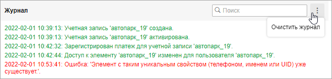 Для записей о создании элемента, изменении его свойств, успешном удалении и т. п. используется зеленый цвет. Красным цветом показываются сообщения об ошибках.