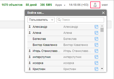 слева от имени. Нажмите на строку необходимого пользователя, чтобы осуществить вход под ним в текущей вкладке, или по иконке в конце строки — чтобы осуществить вход в новой вкладке. Для удобства поиска можно воспользоваться динамическим фильтром. Поиск может осуществляться по пользователям или учетным записям, что регулируется фильтром, расположенным в левом верхнем углу окна.