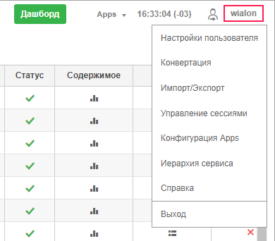 В правом углу верхней панели отображается логин пользователя, под которым был произведен вход в систему.