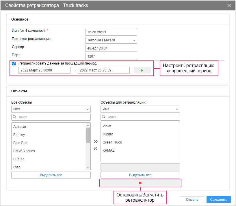 для запуска и остановки ретрансляции и опция Ретранслировать данные за прошедший период.