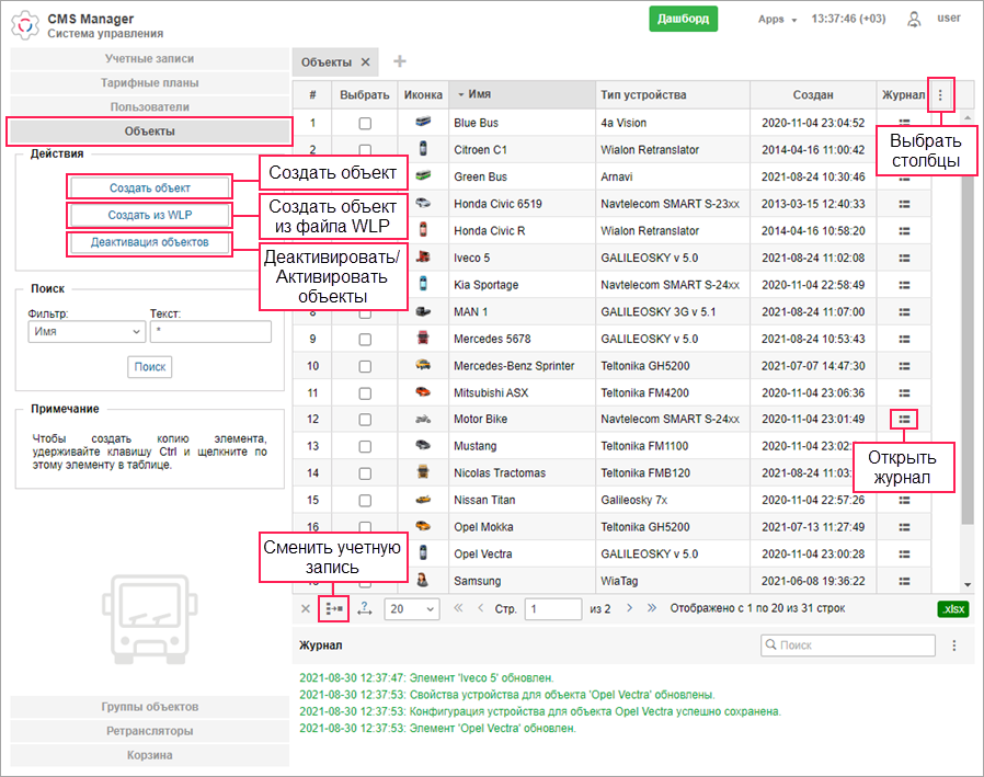 В разделе можно выполнять различные действия с объектами: создание, деактивация, смена учетной записи и др.