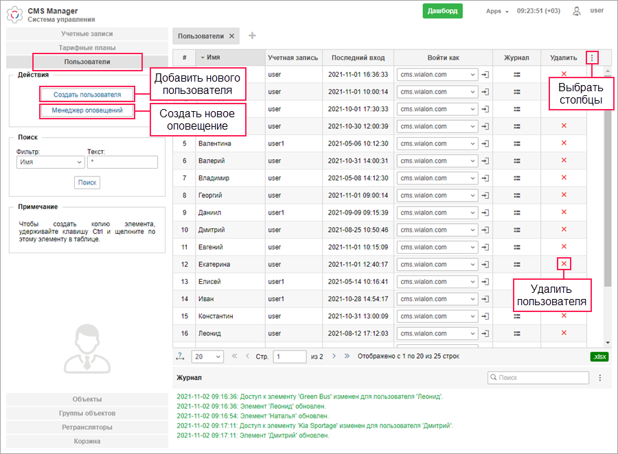 | Удалить | Иконка , которая позволяет удалить пользователя из системы. Если нет права доступа на удаление, вместо иконки показывается прочерк. Смотрите подробнее об особенностях удаления пользователей здесь. |
