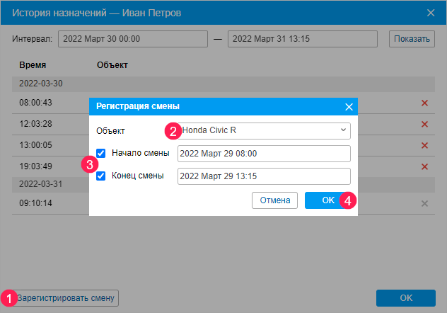 Чтобы вручную создать запись о назначении водителя в прошлом, выполните следующие шаги: