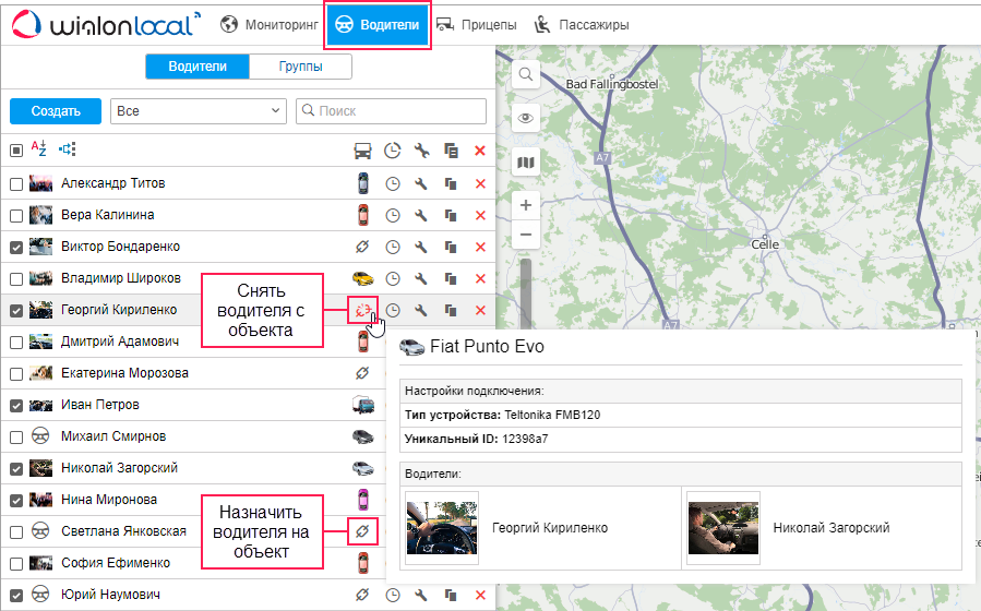 Назначить и снять водителя с объекта вручную можно в режиме Водители или Группы на вкладке Водители с помощью иконок