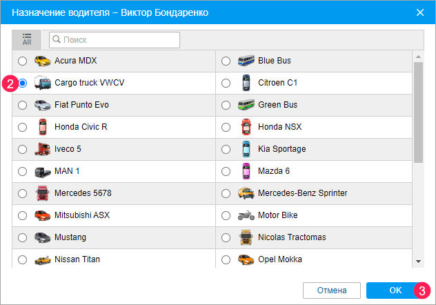 Чтобы назначить водителя на объект вручную, сделайте следующее: