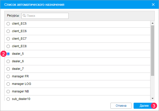 - Выберите ресурс, водители которого должны использоваться для автоматического назначения. Чтобы узнать, какие водители принадлежат определенному ресурс, примените фильтр по ресурсу к списку водителей (расположен справа от кнопки Создать). Если вам доступен только один ресурс, он выбирается автоматически.