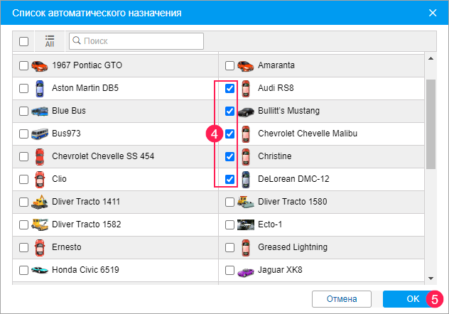 - Отметьте объекты, на которые водители выбранного ресурса должны назначаться автоматически.