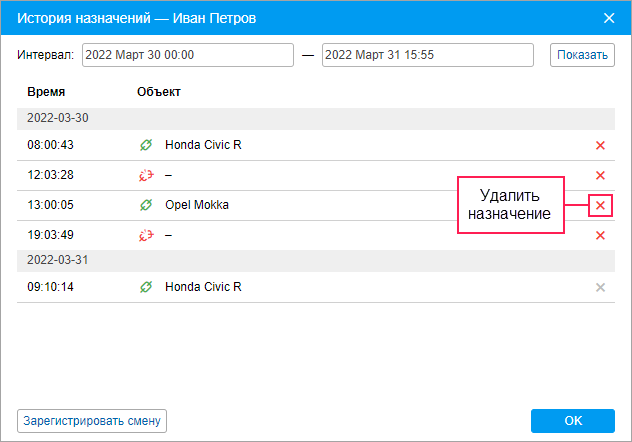 Назначить и снять водителя с объекта можно вручную или автоматически. После этого можно работать с историей назначений.