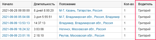 В таблицы большинства отчетов (Поездки, Моточасы, Заправки, Сливы, Превышения скорости и др.) можно добавить колонку с именем водителя. Оно показывается, если водитель был назначен на объект в выбранный интервал отчета.