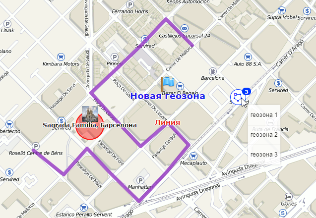 В левой части окна расположен список доступных геозон. Чтобы переместиться на карте к необходимой геозоне, щелкните по ее названию в списке.