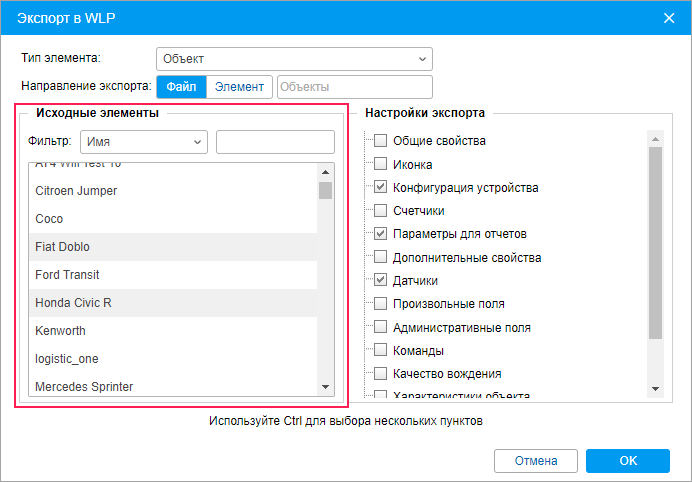 - в отчетах для конкретизации водителя, датчика, события (нарушения), маршрута и его геозоны, а также при выборе геозон;