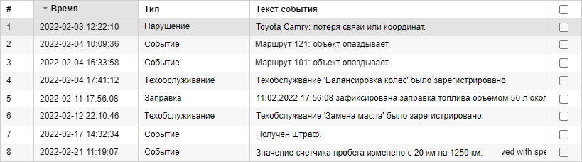 | Тип | Событие (сброс счетчика трафика, события из уведомлений, некоторые произвольные события), нарушение (нарушения из уведомлений, некоторые произвольные события), заправка (зарегистрированная вручную), техобслуживание (зарегистрированное вручную). |