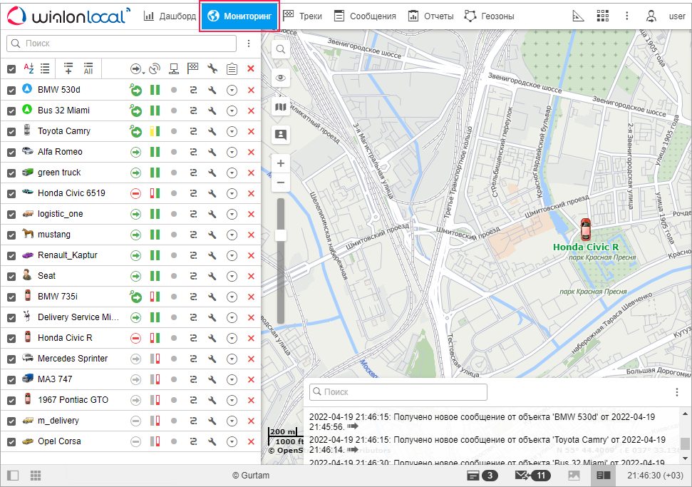 На вкладке Мониторинг доступны основные функции, связанные со слежением. Здесь можно наблюдать за передвижением объектов на карте, отправлять на них команды и сообщения, запрашивать фотографии и видео, отслеживать изменения различных параметров онлайн и т. д.