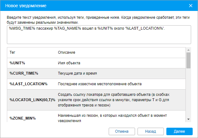 Если информация о данных неизвестна, теги показываются как есть (не заменяются на реальные значения). Исключение составляют следующие теги, которые при отсутствии данных не показываются в тексте уведомления: %UNIT%, %CURR_TIME%, %LOCATION%, %LAST_LOCATION%, %SPEED%, %POS_TIME%, %MSG_TIME%, %UNIT_GROUP%, %ENGINE_HOURS%, %MILEAGE%, %LAT%, %LON%, %LATD%, %LOND%, %GOOGLE_LINK%, %ZONES_ALL%, %ZONE_MIN%, %UNIT_ID%, %MSG_TIME_INT%, %NOTIFICATION%, %TAG_NAME%, %TAG_ID%, %LOSE_RESTORE%, %LOCATOR_LINK%.
