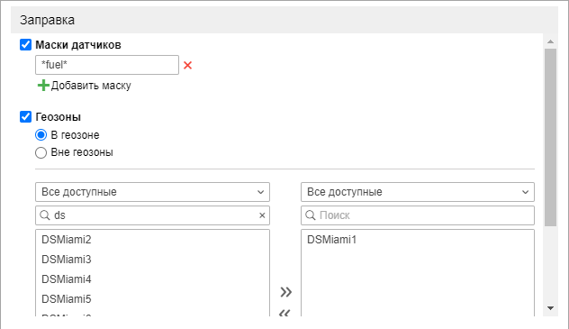 Уведомление данного типа позволяет контролировать заправки топлива. При создании уведомления вы можете задать маски датчиков, которые должны использоваться для определения заправки и ее объема. Также с помощью опции В геозоне/Вне геозоны можно контролировать заправки относительно определенных геозон (должны быть созданы заранее). Выберите ресурс, геозоны которого должны показываться в списке (укажите Все доступные для просмотра геозон всех доступных ресурсов). Выберите геозоны или группы геозон (показываются в квадратных скобках), на которые данное уведомление должно распространяться.