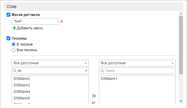 Уведомление данного типа позволяет контролировать сливы топлива. При создании уведомления вы можете задать маски датчиков, которые должны использоваться для определения слива и его объема. Также с помощью опции В геозоне/Вне геозоны можно контролировать сливы относительно определенных геозон (должны быть созданы заранее). Выберите ресурс, геозоны которого должны показываться в списке (укажите Все доступные для просмотра геозон всех доступных ресурсов). Выберите геозоны или группы геозон (показываются в квадратных скобках), на которые данное уведомление должно распространяться.