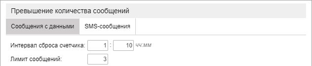 При помощи данного типа уведомления можно контролировать поток сообщений от объекта. Это могут быть либо обычные сообщения с данными (сообщения с координатами, показаниями датчиков и т.п.), либо SMS-сообщения. Укажите лимит сообщений и интервал сброса счетчика. Например, если настроить уведомление, как показано в примере ниже, уведомление сработает, если объект пришлет 3 или более SMS-сообщений в течение 1 часa 10 минут.