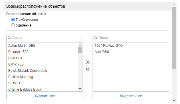 Это уведомление позволяет контролировать взаимное расположение объектов: их приближение или удаление. Выберите критерии (приближение/удаление) и перенесите из левого списка в правый объекты, в случае приближения или удаления от которых должно срабатывать уведомление. Для удобства поиска можно воспользоваться динамическими фильтрами над списками.