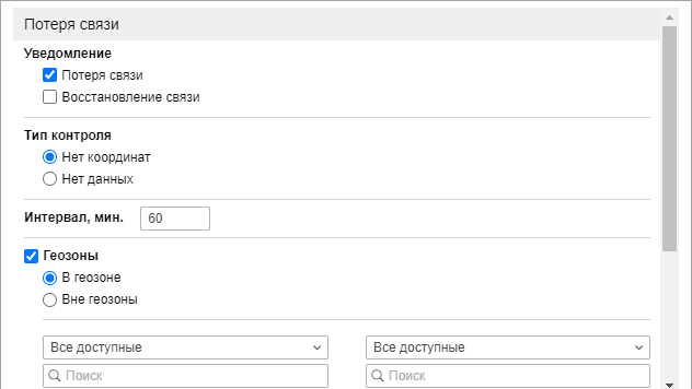 С помощью опции Геозоны можно контролировать потерю связи относительно определенных геозон или групп геозон. Укажите тип контроля: срабатывать внутри геозоны или за ее пределами. Выберите ресурс, геозоны которого должны показываться в списке (укажите Все доступные для просмотра геозон всех доступных ресурсов). Выберите геозоны или группы геозон (показываются в квадратных скобках), на которые данное уведомление должно распространяться.