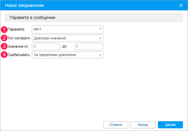 С помощью этого типа уведомлений можно контролировать параметры датчиков в сообщениях. Он позволяет контролировать параметры, присылаемые оборудованием и не предусматривает контроль виртуальных параметров (sats, speed, lat и т. п.).