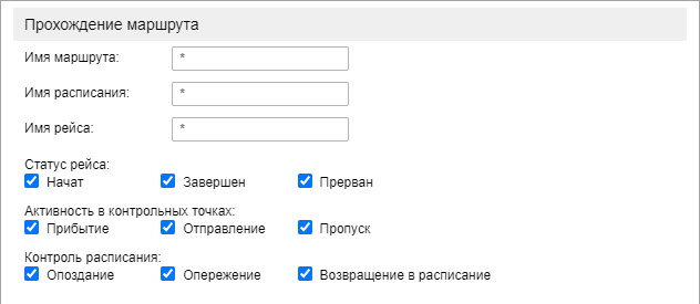 Для контроля маршрута укажите изменения, которые должны контролироваться при выполнении рейса по этому маршруту: начало, завершение, прерывание рейса, вход/выход/пропуск контрольной точки, опережение графика или отставание и др.