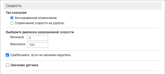 Для уведомлений о нарушении скоростного режима необходимо выбрать тип контроля: фиксированное ограничение или ограничение скорости на дорогах. Для типа Фиксированное ограничение укажите диапазон разрешенной скорости. Для типа Ограничение скорости на дорогах укажите допустимое превышение.