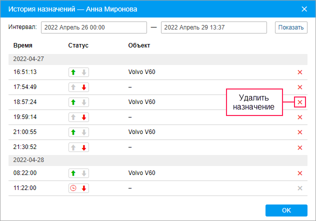 Неверное назначение или снятие можно удалить из списка, нажав на иконку