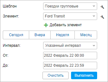Выберите элемент системы (на него должно быть право доступа Запрос сообщений и отчетов), по которому должен быть сформирован отчет. В зависимости от типа отчета, указанного в шаблоне, можно выбрать объект, группу объектов, пользователя, водителя, прицеп, маршрут, ресурс, ретранслятор, группу водителей или прицепов, пассажира или группу пассажиров. Для отчета типа Группа объектов может быть указано несколько элементов. Для этого нажмите на кнопку Добавить элемент (