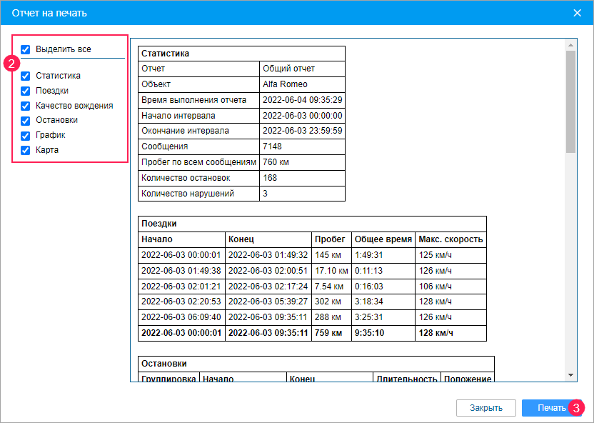 В левой части окна выберите те таблицы, графики или другие разделы отчета, которые вы хотите вывести на печать. Чтобы выбрать все разделы, нажмите на Выделить все. В правой части показывается содержимое отчета.