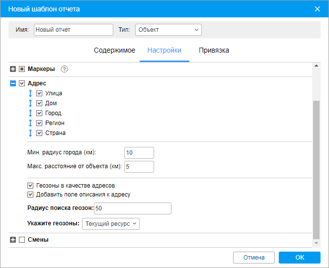 Также можно расширить или сузить перечень геозон, используемых в качестве адресов. По умолчанию применяются все геозоны, принадлежащие тому же ресурсу, что и шаблон отчета. Однако можно задействовать как все доступные пользователю ресурсы, так и, наоборот, ограничиться рамками одной конкретной группы геозон (она должна принадлежать тому же ресурсу, что и шаблон отчета). Необходимый вариант выбирается в выпадающем списке Укажите геозоны (группы геозон показаны в квадратных скобках).