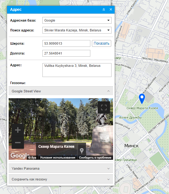 При наличии ключей Google или Yandex можно увидеть панорамные снимки найденного места. Для этого необходимо развернуть секции Google Street View или Yandex Panorama, расположенные ниже.