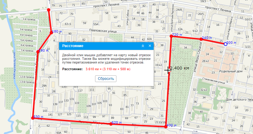 Чтобы очистить карту и начать измерения заново, щелкните по кнопке Сбросить.
