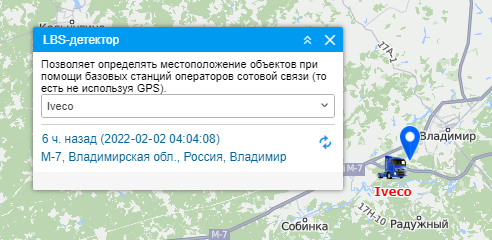 После выбора объекта поиск его местоположения осуществляется автоматически. Затем карта центрируется на найденном местоположении, которое, в свою очередь, будет выделено при помощи синего маркера. Также под маркером может быть отображено/скрыто имя объекта, за что отвечает соответствующая кнопка в нижней панели. Кроме того, в окне LBS-детектора отображается информация, которая включает в себя время фиксации последнего местоположения, а также его адрес. Справа от данной информации располагается кнопка обновления по нажатии на которую вы получите более актуальную информацию о местоположении выбранного вами объекта, если таковая имеется.