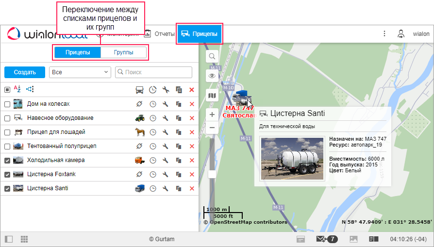 Для работы с прицепами щелкните по вкладке Прицепы в верхней панели или выберите одноименный пункт в главном меню. Вы можете работать как с прицепами, так и с их группами.